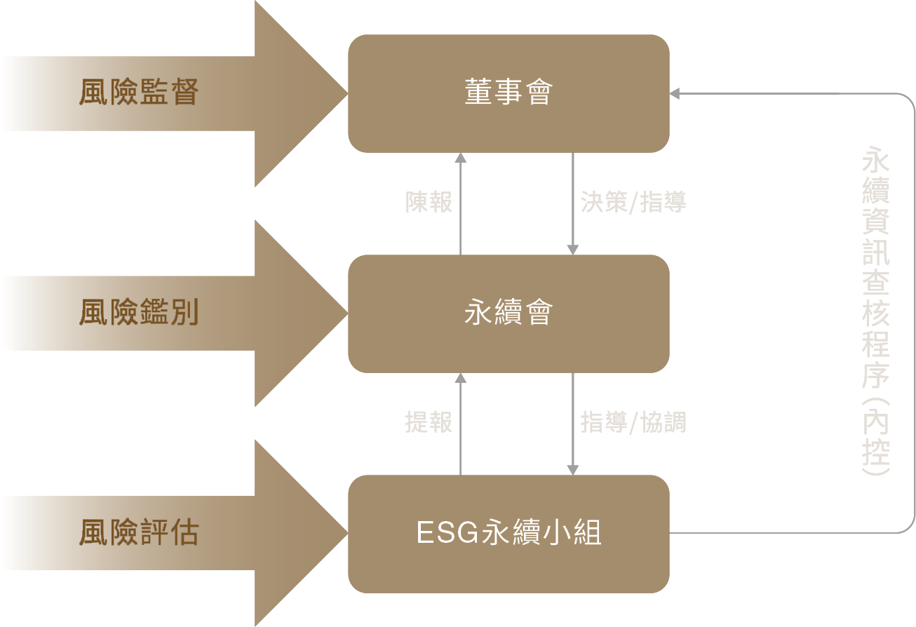 董事會負責掌控公司氣候變遷議題,制定營運管理方針並監督相關決策。由「永續發展委員會」(以下簡稱永續會)統籌氣候變遷減緩、調適、風險鑑別、情境分析、策略制定及指標目標設定等工作。下設「ESG永續工作小組」(以下簡稱永續小組),定期將執行成果報告永續會,永續會再定期向董事會陳報氣候變遷風險及工作進展。